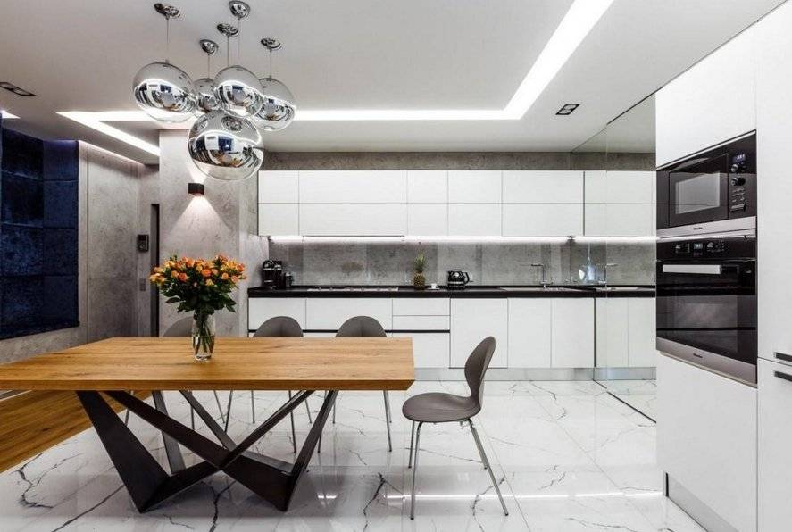 Разнообразие натяжных потолков позволяет каждому владельцу современной кухни выбрать изделие на свой вкус и размеры финансового достатка. Глянцевые варианты создают зеркальный эффект, позволяя отражать всю площадь комнаты и визуально увеличивая пространство. Матовые классические потолки считаются качественной универсальной отделкой. Точечные светильники – оптимальный вариант для кухни. Если позволяет пространство, можно, в качестве дополнительного освещения, использовать объемные люстры.