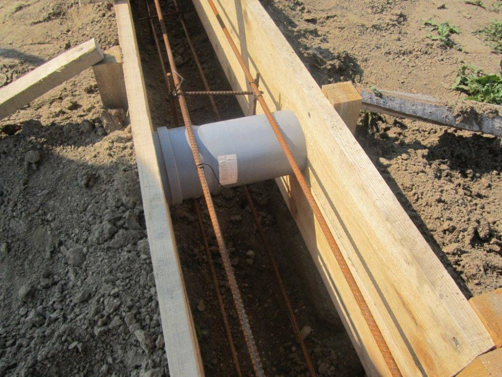 - Сначала на нужной высоте происходит установка жестяной или асбестоцементной трубы перпендикулярно стенкам. Эти изделия должны иметь сечение около 15 см. чтобы трубу не сложило во время заливки бетона, ее необходимо наполнить песком.