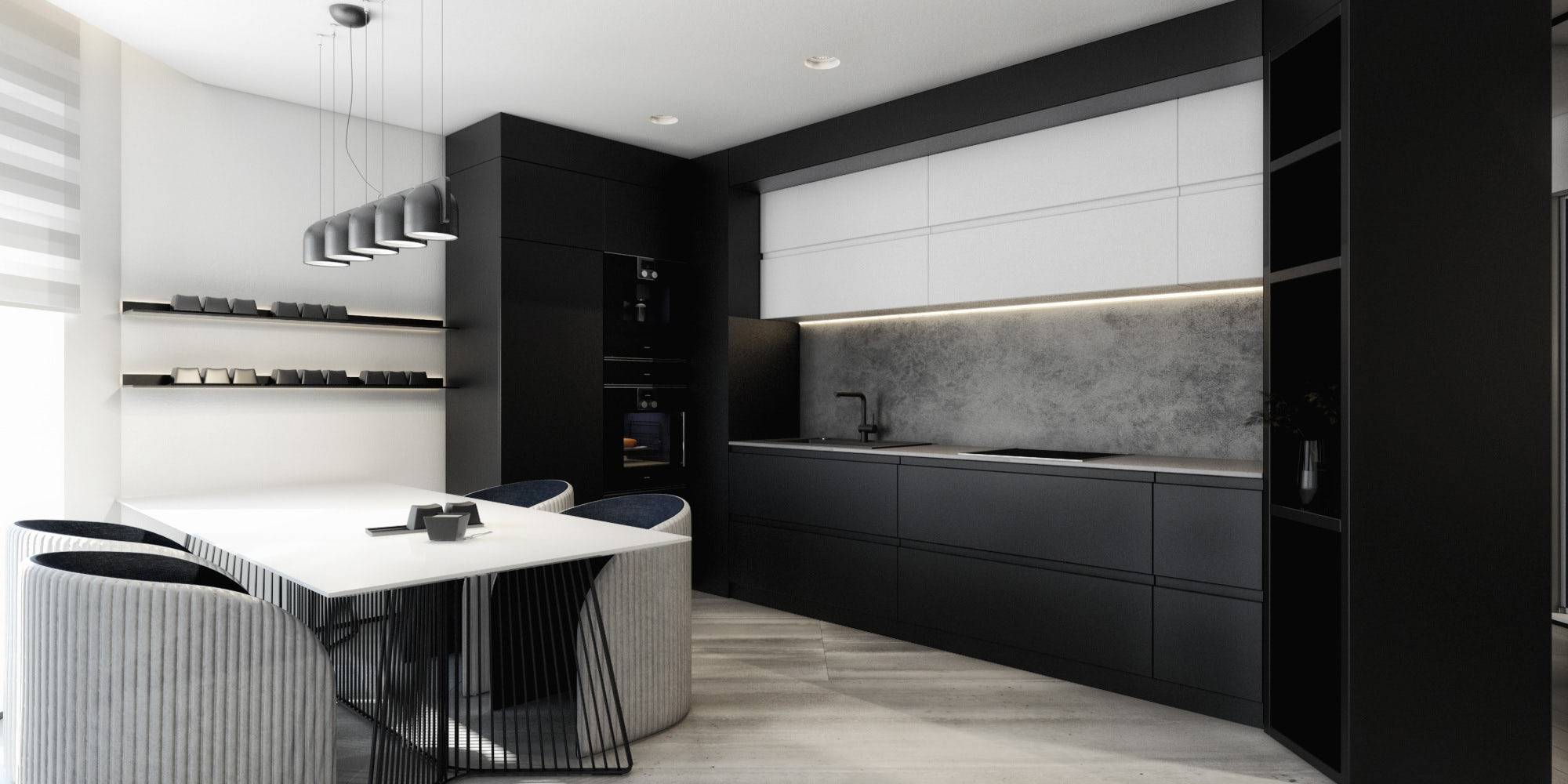 Отделку кухни, выполненной почти в любой стилистике, допустимо выполнять в бело-черной цветовой гамме. Оформление делается ярким, контрастным либо присутствуют плавные градиентные переходы. При желании, используется один-два дополнительных колера, количество которых не превышает 5-10% от общей площади комнаты.