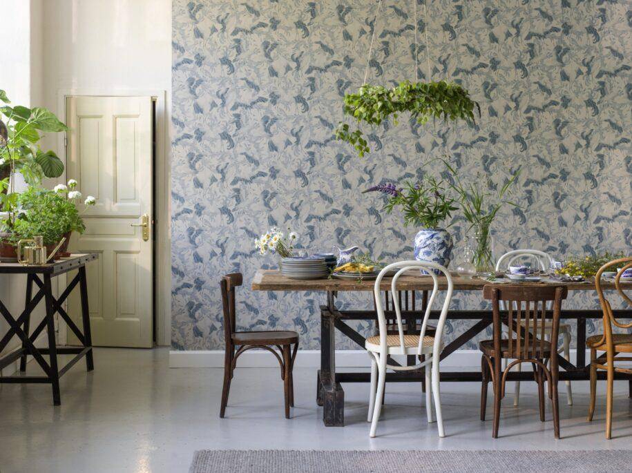 Обои не клеят в рабочей зоне у стола, а также избегают приклеивание покрытия, если обеденный стол приставлен к стене. Либо вести себя предельно аккуратно во втором случае.