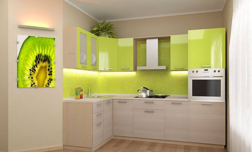 светлый тон стен, пола и потолка. При этом выполнять кухню в чисто белом цвете нежелательно. Во-первых, этот цвет быстро утомляет зрение, а во-вторых, придется тщательнее следить за чистотой кухни. Гораздо лучше и просторнее смотрятся помещения в бежевых, светло-серых или голубых тонах; свет в помещении. В идеале – естественный свет от окна, находящегося на солнечной стороне здания. При недостатке солнечного света в кухне необходима грамотная организация искусственного освещения: спотов, светильников, светодиодных лент и т.п.; лакированные кухонные поверхности. Как известно, зеркала и глянцевые поверхности создают эффект расширения пространства за счет отражения. Однако если в них будет отражаться темная мебель, пол или стены – эффект будет обратным. Нельзя забывать и о том, что глянец требует более пристального ухода за ним; замена открытых полочек на один пристенный шкаф. Удивительно, но многочисленные полочки на стене «съедают» визуально гораздо больше пространства, чем сплошной закрытый шкаф. Чтобы еще больше увеличить помещение таким способом, шкаф по возможности устанавливается вдоль короткой стены; цвет и рисунок обоев на стенах. Обои для маленькой кухни следует выбирать светлых оттенков и без ярких цветовых пятен