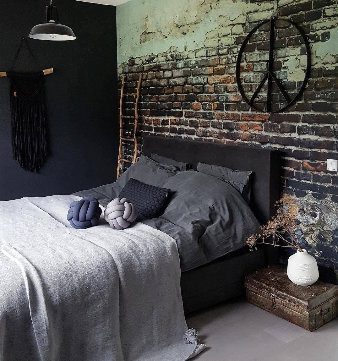 Спальня — зона отдыха, расслабления и сна, поэтому рекомендуется отделывать «под кирпич» только стену в изголовье кровати. Предпочтительны светлые тона, а грубую фактуру можно уравновесить лёгкими занавесями, мягким покрывалом и пушистым ковром. Обои «под кирпич» — идеальное решение для спальни в стиле минимализм или лофт.