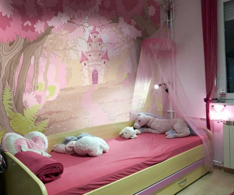 Розовые обои будут великолепно смотреться в детской комнате девочки, представляющей себя в роли прекрасной принцессы из сказки. Ты можешь оклеить комнату однотонными розовыми полотнами или чередовать оттенки. Хороший вариант – фотообои с изображениями фей, королевских персон, замков, где доминирующая роль будет отведена розовой палитре.