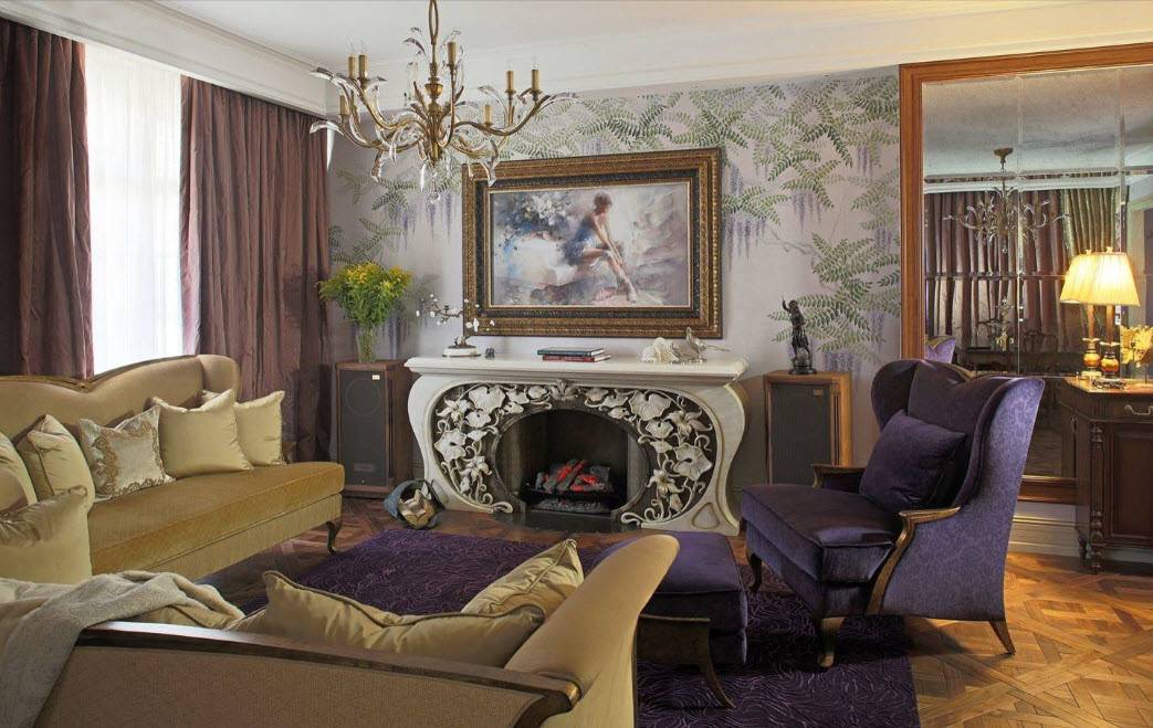 Интерьер обставляют массивной или утонченной меблировкой с изящными формами. Предметы выполненные из ценной породы древесины дополняют с помощью металлической фурнитуры и натуральной обивки из атласа, хлопка или бархата с некрупными рисунками.