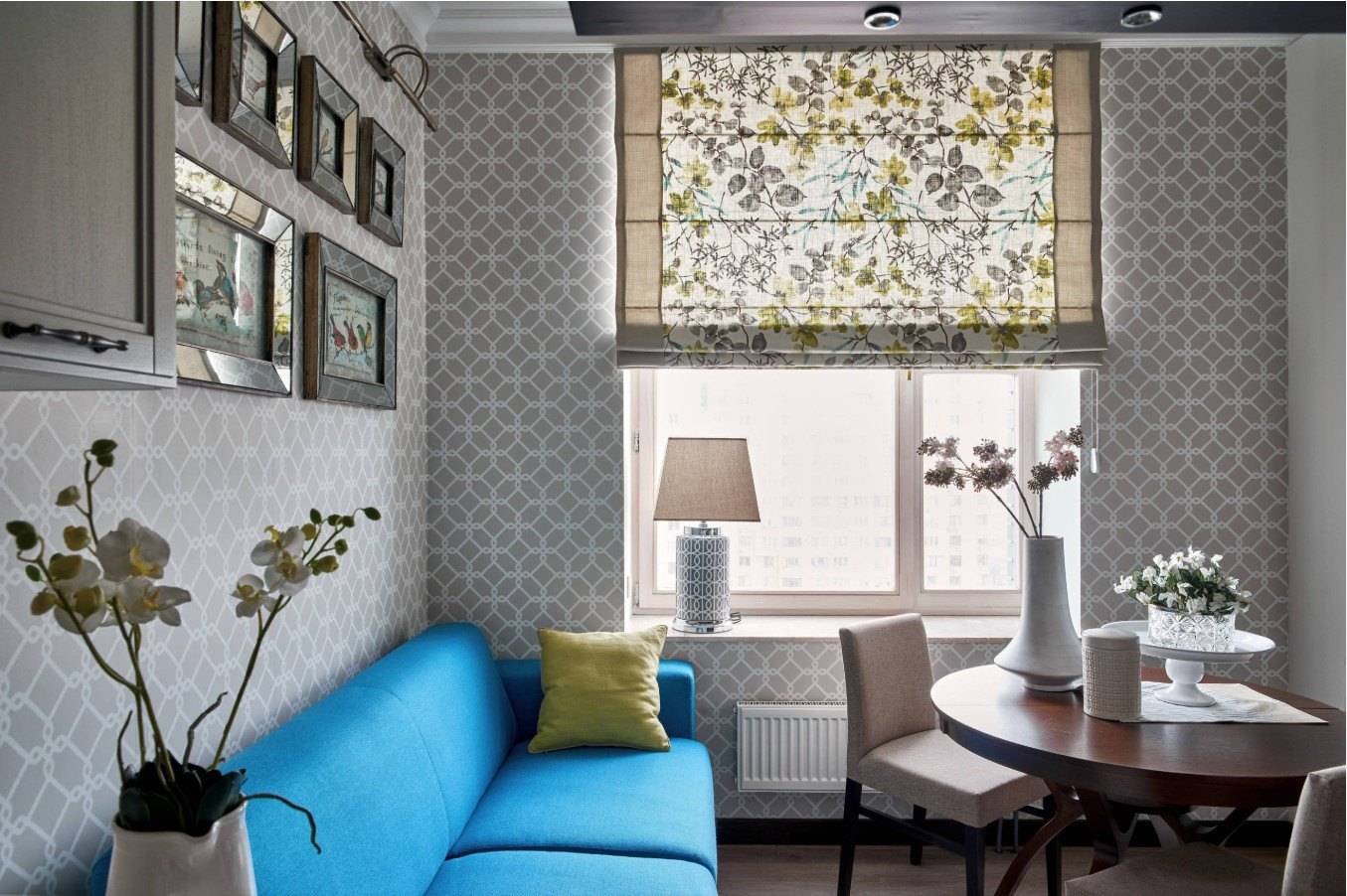 Теплая гостиная с панорамными окнами и холодно — голубыми обоями
