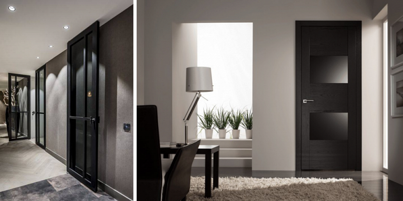 - Демонстрация контраста. В этом случае, если межкомнатные двери будут темными, то аналогичного цвета должны быть только пол и мебель. Это сочетание со светлыми обойными листами придаст вашей прихожей элегантности и настоящего шика. Однако помните, что крупные темные пятна дверей и пола подойдут не для всех. Если вы это осознали поздно, когда ремонт практически завершен, то отдайте предпочтение остекленным дверям темного оттенка. Картину они не испортят, однако смотреться будут легче.