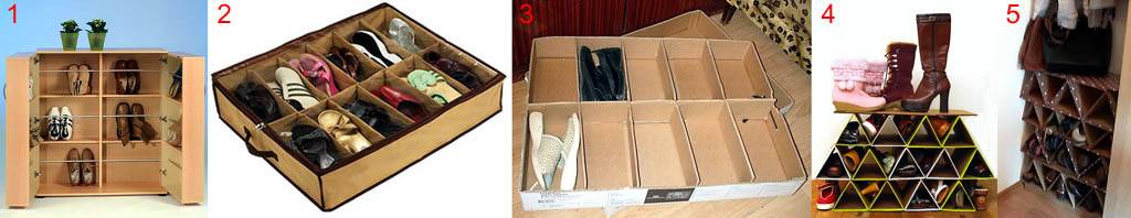 А что делать, если под обувной шкаф места вообще нигде нет? В таком случае выручит органайзер для длительного хранения не носимой в настоящее время обуви. Правда, в мебельных магазинах вам, скорее всего, предложат специальный обувной шкаф-органайзер (поз. 1 на рис.), который займет, с распахнутыми дверцами, где-то от 2 кв. м. Но в галантерейных и одежных магазинах можно найти несравненно более дешевый обувной органайзер-чемодан из ткани, поз. 2, помещающийся под кроватью. Кроме того, обувь в нем свободно дышит.