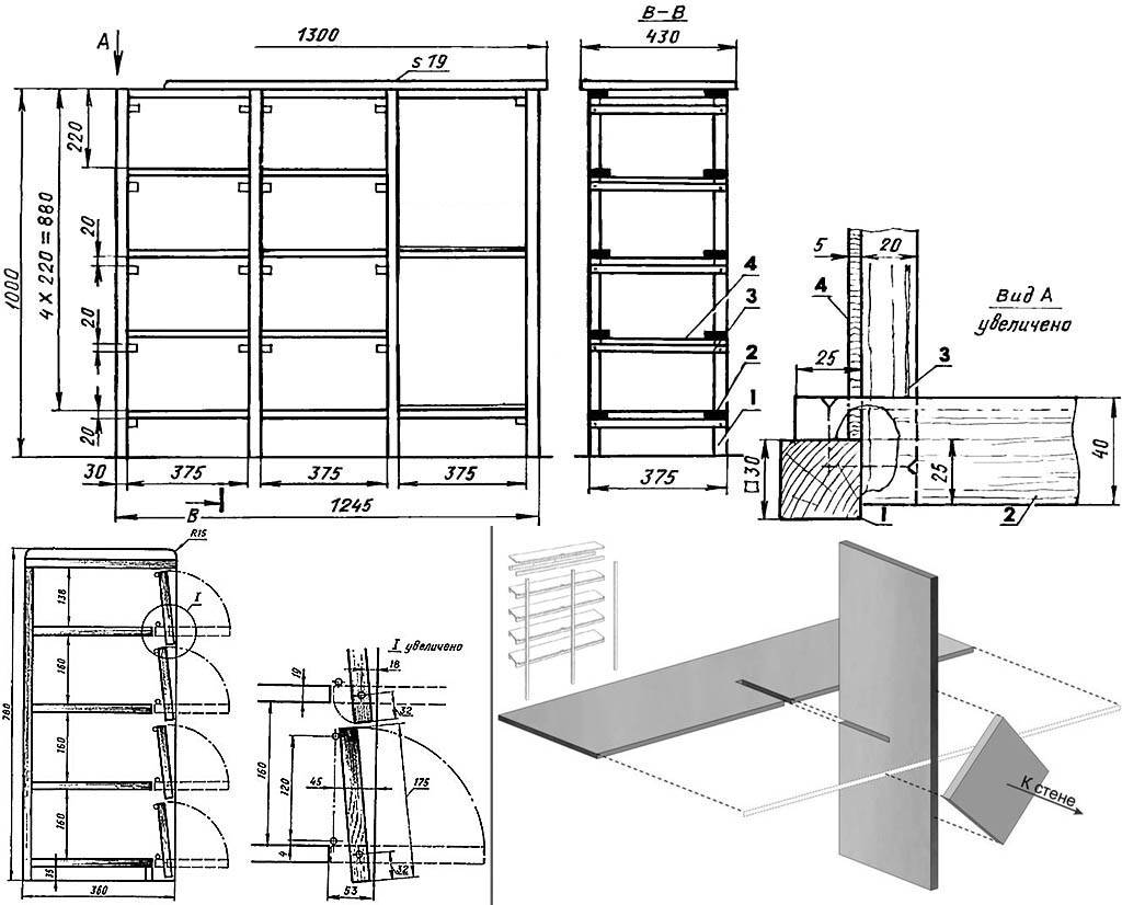 Схемы и чертежи стеллажа и полки для хранения обуви