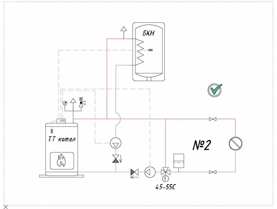 Обвязка твердотопливного котла с бойлером косвенного нагрева подходит для любой схемы подключения. Бойлер служит для нагрева холодной воды в целях горячего водоснабжения.
