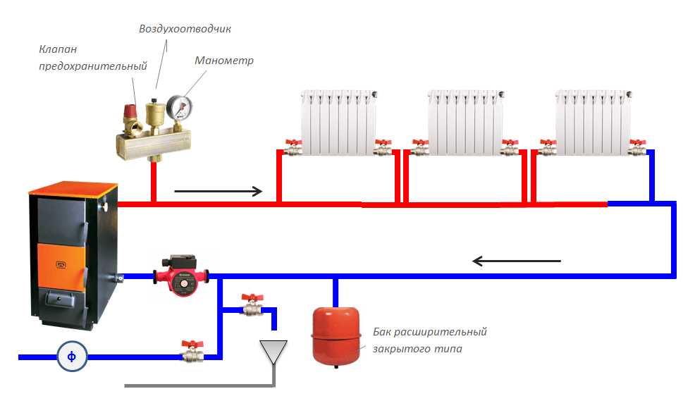 В отличие от открытой, здесь необходимо установить мембранный бак на обратном трубопроводе. Для эффективного функционирования его размер должен превышать на 10 % объем теплоносителя в целом по системе.