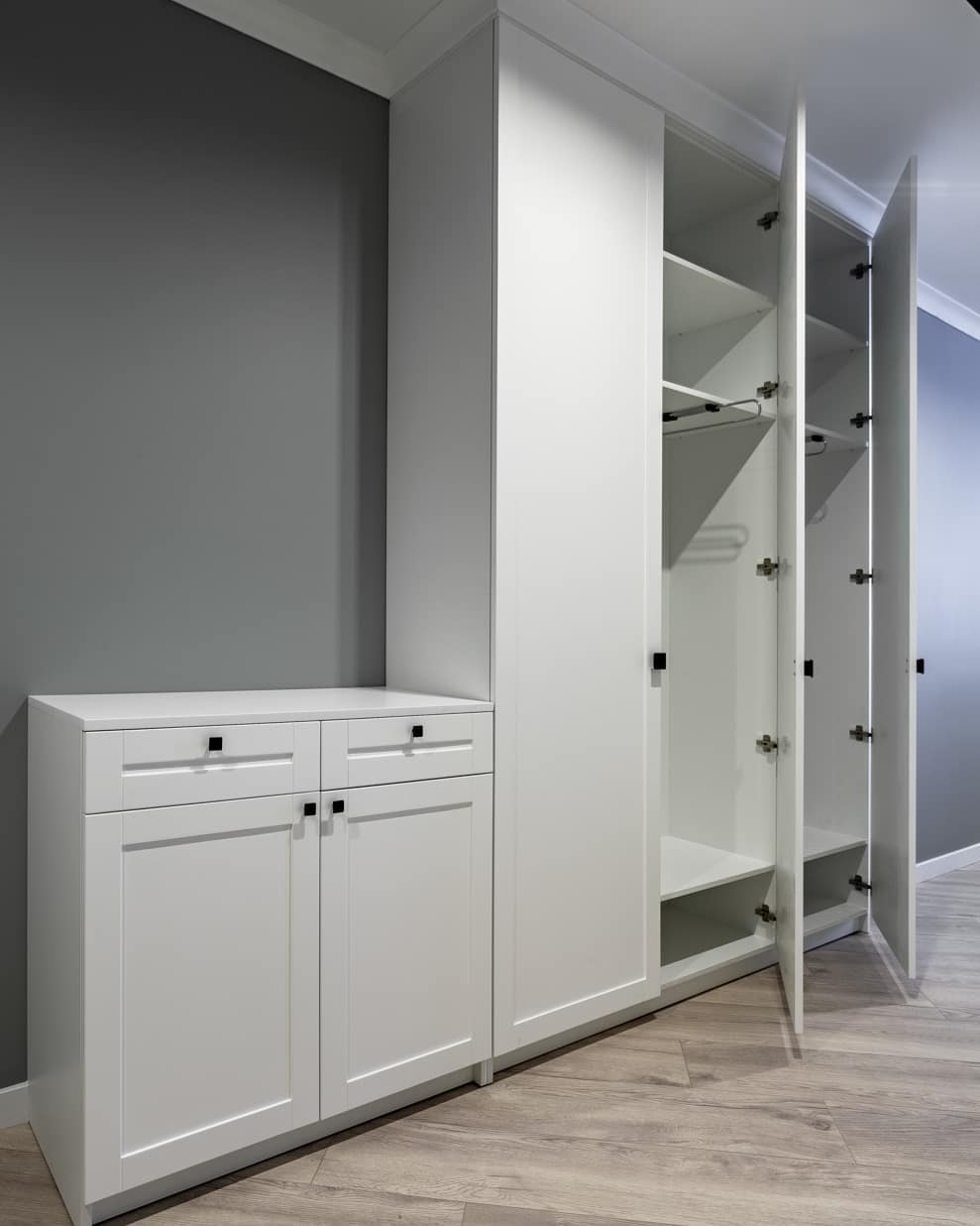 Это только необходимые вещи. Например, объединенный с местом для хранения обуви, пуфик для сидения. Имеет место закрытый шкаф, открытая вешалка, маленький столик для различных мелочей, зеркало, крючки или полочки для сумок и зонтов.