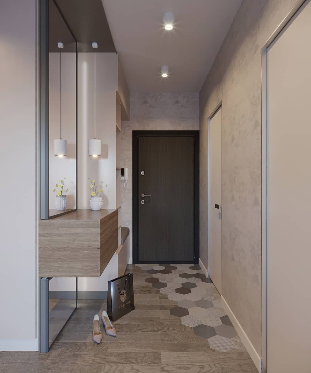 Для разграничения пространства в дизайне коридора-прихожей делают зонирование. Продуктивный способ — выбор двух отделочных материалов. Зона прихожей покрывается плиткой, а коридор паркетом, ламинатом или ковролином. Такое решение подойдет для угловой Г-образной прихожей. А, если коридор шириной 1 метр или больше прямой и длинный, чтобы его визуально укоротить и расширить, полы застилают по диагонали.