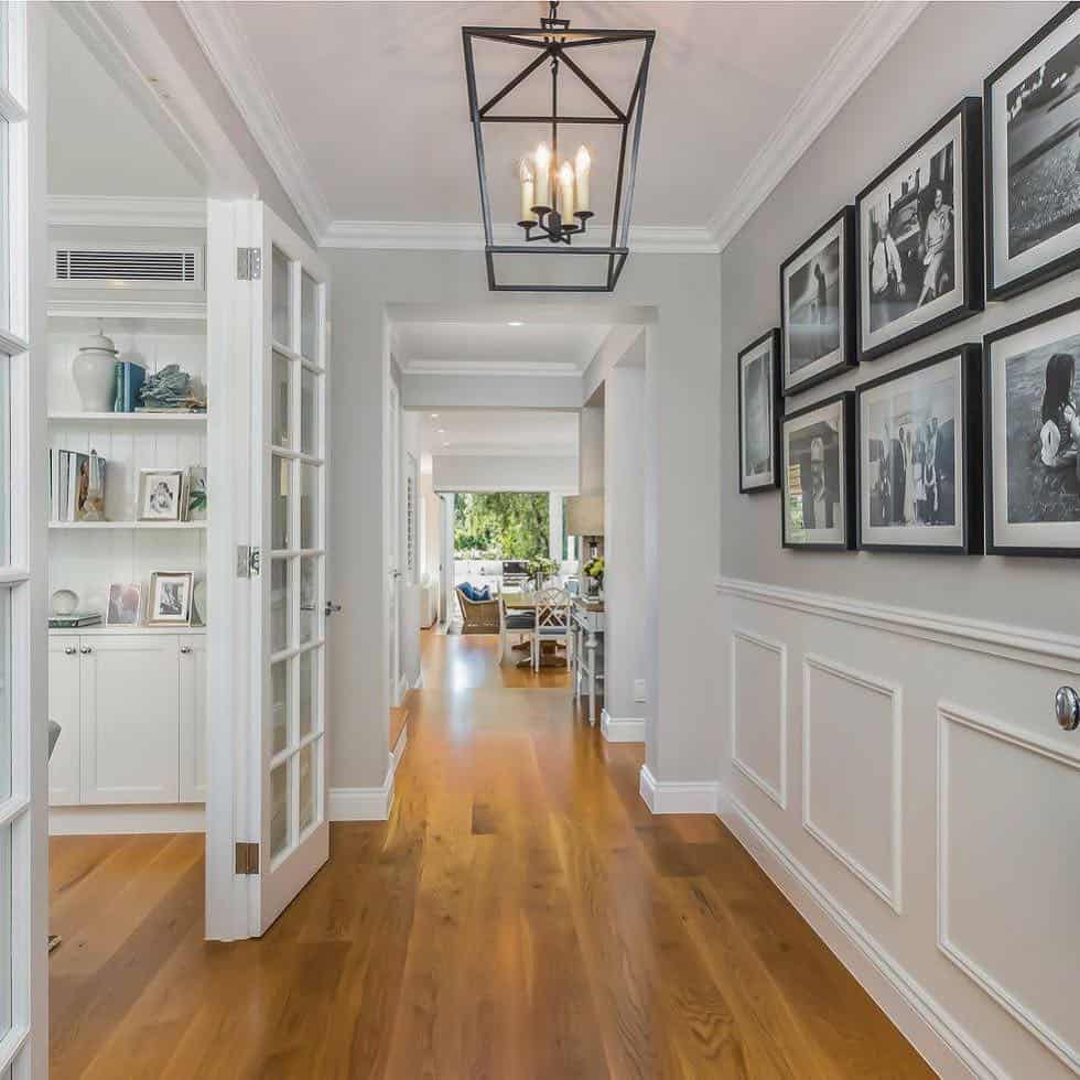 Оформляя стены, можно комбинировать разные цвета и материалы. Прекрасно смотрятся в просторных помещениях пробковые и деревянные панели, декоративная штукатурка. Для отделки пола обычно используется влагостойкий ламинат или керамика. Просторная прихожая позволяет с легкостью оборудовать гардеробную.
