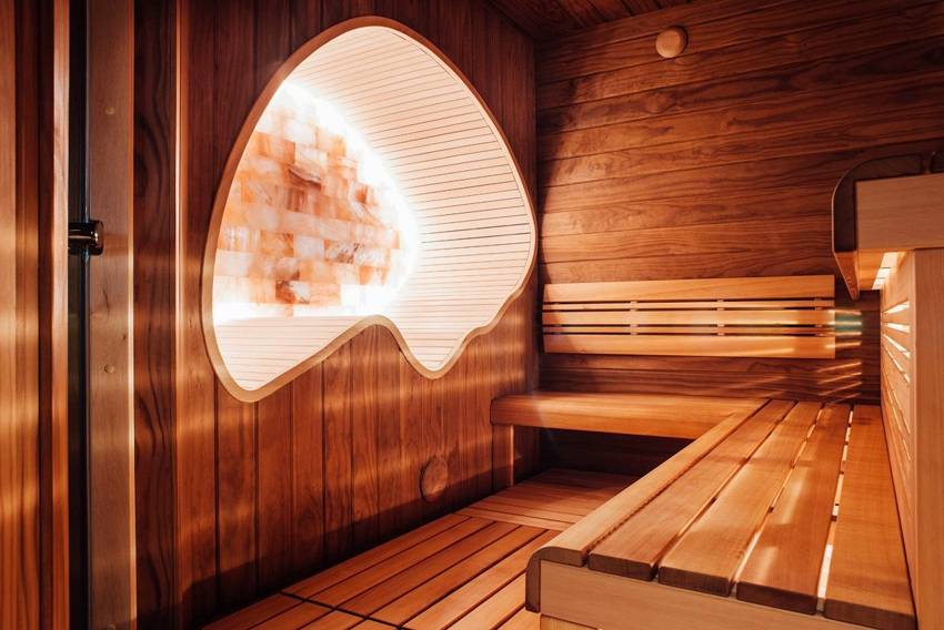 Красивое освещение в сауне с использованием светодиодных лент и подсветки экрана из гималайской соли