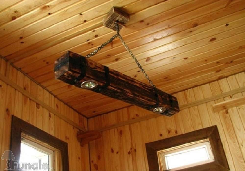 Среди потолочных светильников для бани, люстры имеют самый красивый дизайн. Они отличаются от других моделей не только высокими декоративными качествами, но и самой конструкцией. Желательно, чтобы корпус прибора был деревянным. Сама же люстра подвешивается к потолочному основанию с помощью цепи.