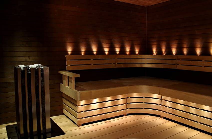 Нежелательно брать для сауны потолочные светильники. Горячий воздух гораздо легче холодного. Он скапливается в верхней части комнаты, поэтому температура в этой зоне очень высокая. Не каждый прибор способен выдержать подобную нагрузку. Лучше располагать светильники на нижнем или центральном уровнях, а сами приборы обязательно должны иметь жаропрочный корпус.