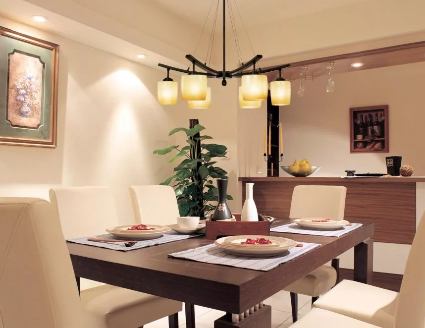 В первую очередь рекомендуется повесить над обеденным столом люстру. Для рабочих мест лучше всего использовать несколько мощных точечных светильников.