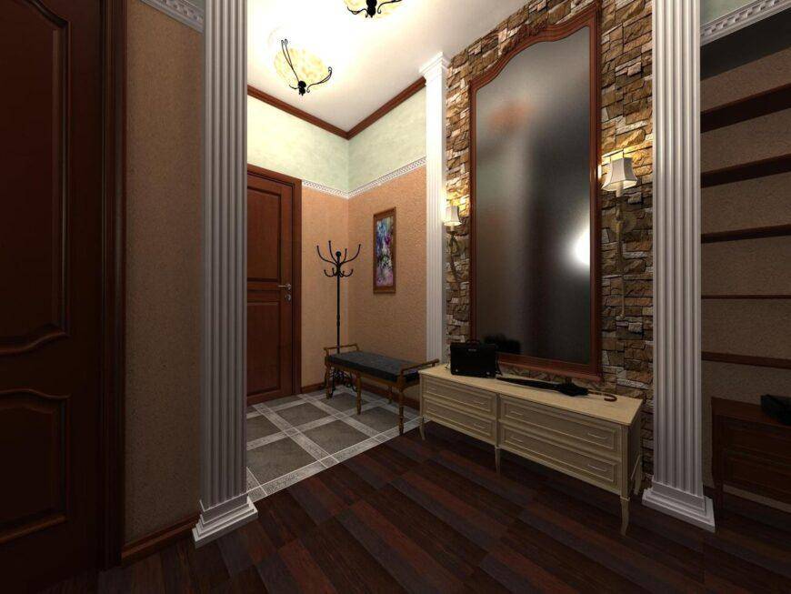 Если свободного пространства в коридоре или прихожей недостаточно, то от применения различных разновидностей декоративных камней лучше отказаться. Лучше выбрать один наиболее подходящий вариант, или же комбинировать отделочный материал, схожий по оттенку и фактуре. Если естественный свет не попадает в ограниченное пространство прихожей, то рекомендуется отдавать предпочтение светлым тонам декоративного камня, который дополняется выступами от основы. Чтобы разнообразить цветовую палитру, можно просто комбинировать декоративный камень и иной тип отделки.
