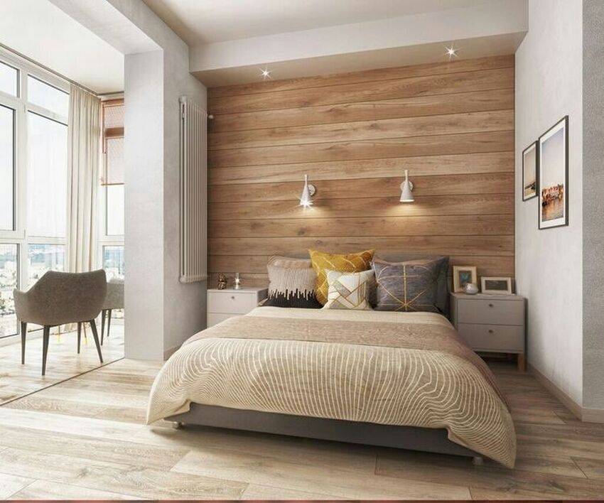 Дизайн спальни, со стеной отделанной ламинатом, выделяется своей новизной и современностью на фоне других устаревших вариантов отделки. Посмотрите сами.