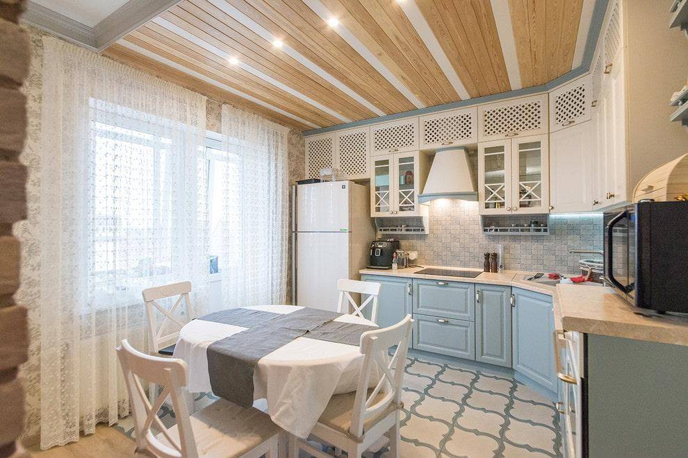 Не обязательно обшивать деревом всю квартиру, достаточно использовать вагонку на кухне (фото показывает различные варианты).