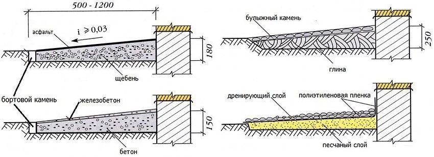 - Угол уклона, обеспечивающий отведение воды от фундамента.