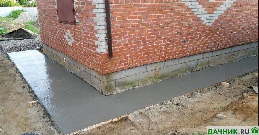 Формирование компенсационного шва. К стене строения крепят демпферную ленту или рубероид. Этот зазор позволит уменьшить давление на фундамент и предотвратить появление трещин на бетоне. Можно также вдоль стены поставить деревянную доску, которую после заливки нужно убрать, а оставшуюся после неё щель заполнить песком; Заливка бетона. Покупается готовый состав М400 или приготавливается с помощью бетономешалки. При самостоятельной заготовке смеси используют следующее соотношения компонентов: 1 часть портландцемента, 3 части песка, 4 части щебёнки и воды примерно 50% от количества цемента