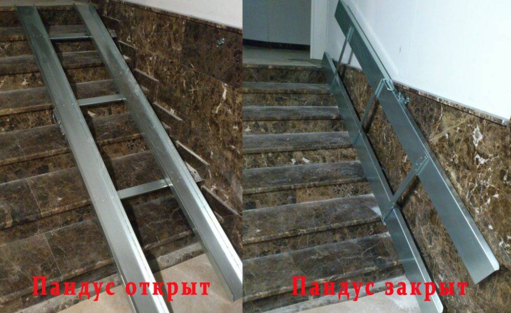 Пандусы откидного типа не могут быть сняты с лестничного пролета при необходимости. Однако их можно свободно сдвинуть для обеспечения свободного перемещения ходячих людей. Подобные конструкции монтируют в многоэтажных жилых домах. Откидные пандусы могут быть представлены в виде параллельно расположенных полотен или платформ. Изготавливают подобные изделия из алюминия.