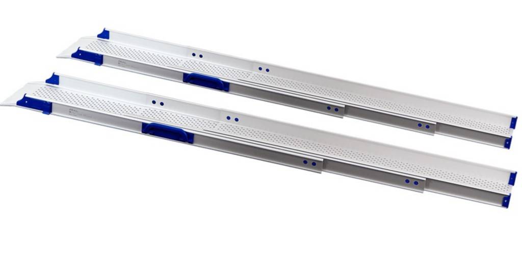 - Раздвижные телескопические пандусы — это легкие, переносные универсальные конструкции в виде двух отдельных аппарелей. Вес и размеры в собранном и разобранном виде для разных моделей отличаются, но все они сделаны из прочного материала, преимущественно алюминия, с нескользящим покрытием и выдерживают вес 200–400 кг.