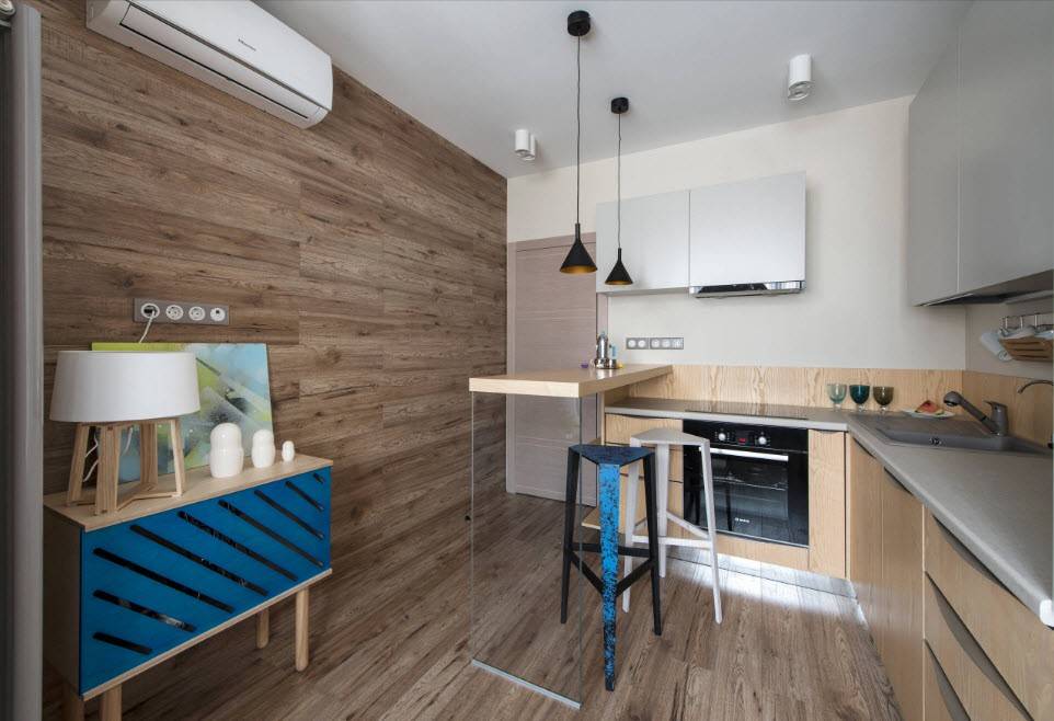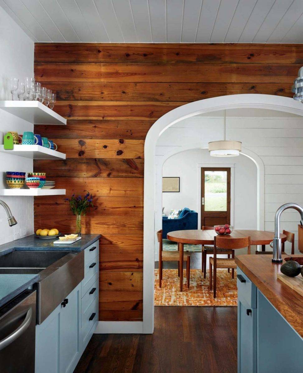 Обшивка стены деревянной вагонкой — интересный вариант для кухни в стиле кантри, прованс. Но это совсем небюджетный вариант отделки — натуральный материал стоит дорого.