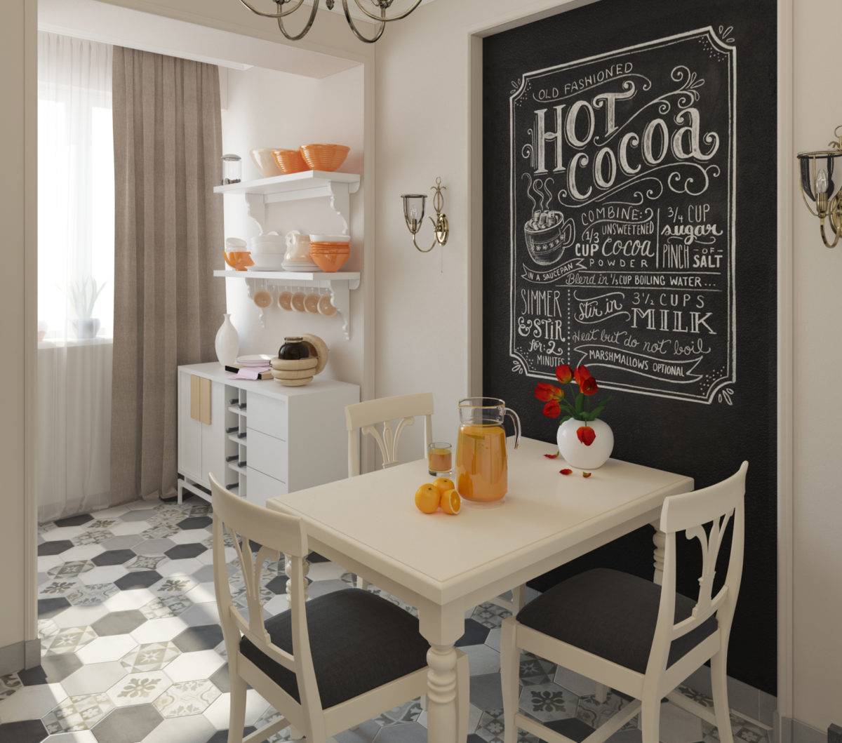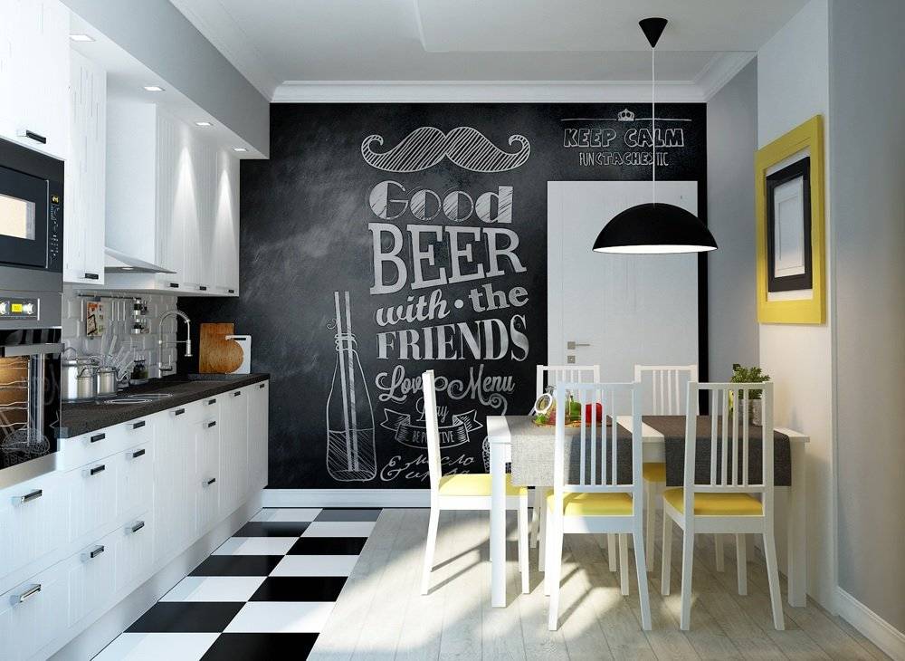 Украсить помещение и добавить интересный акцент на стену кухни можно при помощи доски для рисования. Не надо искать доску и прибивать на стену — достаточно закрасить нужную часть или стену полностью специальной графитовой краской.