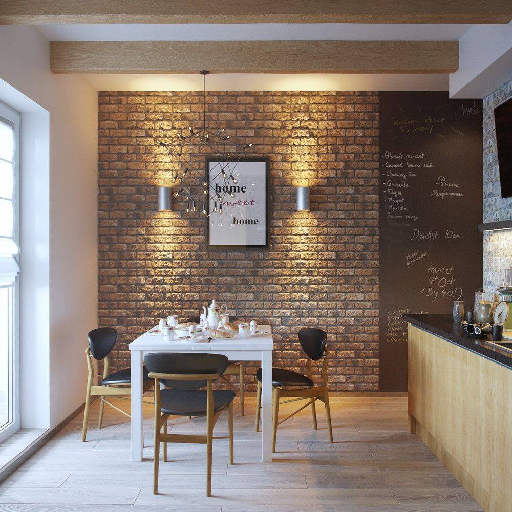 Декоративные панели под кирпич — способ неординарного оформления интерьера помещения. Своим внешним видом они повторяют стену, выложенную из кирпича, что смотрится очень красиво в дизайне интерьера кухни. Кроме своих эстетических качеств, они значительно снижают трудовые и материальные затраты на облицовку не только внутренних стен, но и фасада здания. Отделочный материал представляет собой специальную плиту, на которую прикреплены декоративные кирпичи при помощи клеевого раствора. Кирпичи могут быть разной формы и размера.