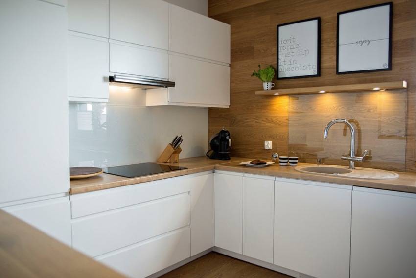 Так, в белой кухне хорошо смотрится тёмный фартук либо цветной. При выборе нужно учесть, что на глянцевых поверхностях будут хорошо видны даже незначительные загрязнения. Поэтому лучше рассмотреть матовые варианты. Кремовые, серые и бежевые оттенки фартука в белой кухне будут смотреться сдержанно, но немного скучно.