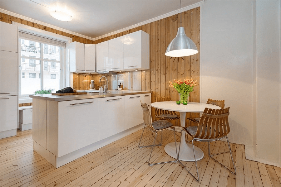 На кухне, как правило, используют два вида отделки стен. Материалы рабочей зоны и так называемого «фартука» должны быть максимально практичными. В обеденной зоне можно использовать покрытия меньшей прочности, но они также должны легко мыться. Такой способ комбинирования покрытия в разных зонах даст максимальный эффект и поможет достичь идеального уровня в сочетании декоративных и технологических характеристик.