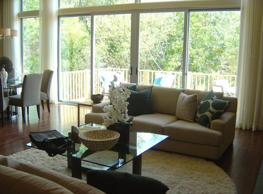 В квартирах многоэтажных строительных объектов панорамное остекление в зале актуально при примыкании с балконом или лоджией. При этом они будут служить зоной отдыха или рабочим местом. Для изолирования пространства во время уединения достаточно использовать занавески. Также французские окна в зале могут увеличить полезную площадь.