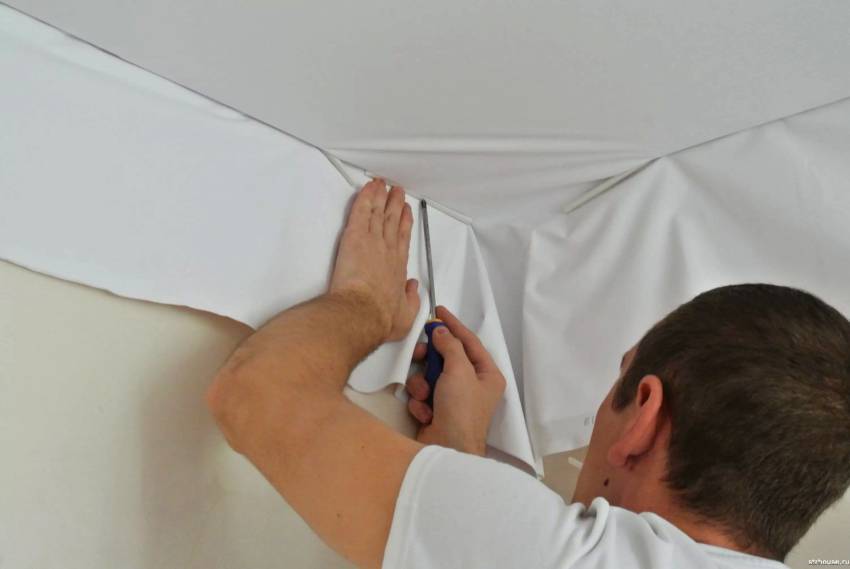 В обязательном порядке полотно должно содержать помеченный базовый угол. Именно с этого угла полотна пленки необходимо начинать монтаж натяжного потолка.