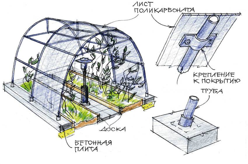 Схема конструкции парника из поликарбоната с использованием пластиковых труб и бетонных плит
