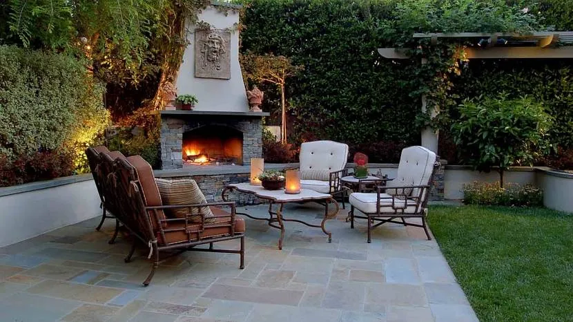 Для декора и защиты от любопытных глаз патио огораживают живой изгородью из вьющихся растений, высаживают по периметру кустарники. Часто здесь ставят переносной или стационарный мангал, барбекю, чтобы готовить на природе. Некоторые владельцы устанавливают камин, очаг, чтобы греться у огня по вечерам. Дополнением площадки станет небольшой фонтан, аккуратный газон, легкий навес от дождя.