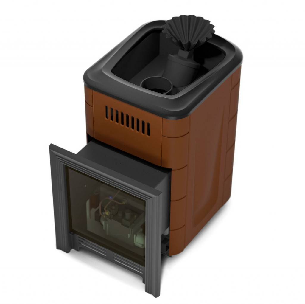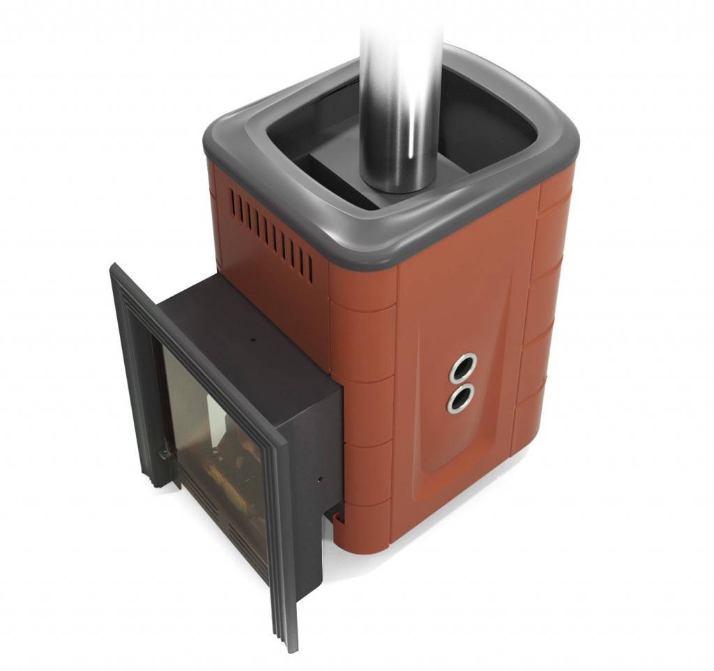 Банная печь известного отечественного производителя постоянно модифицируется. Текущая модель отличается высокой теплоэффективностью и безопасностью. За счет обтекаемой округлой формы каменки, газы не скапливаются в камере, а сразу выводятся наружу через дымоход. В устройстве отсутствуют застойные зоны, поэтому при повторном запуске исключаются хлопки от скопившихся газов. Еще одна отличительная особенность модели – в ее продуманном дизайне. Внешне устройство напоминает обычную печку, ведь снаружи нет никаких труб: все они надежно спрятаны под металлическим корпусом, а вентили для запуска печи скрыты за дверцей из жаропрочного стекла. Модель представлена в двух цветах: сдержанном серебристом и более ярком кирпичном.
