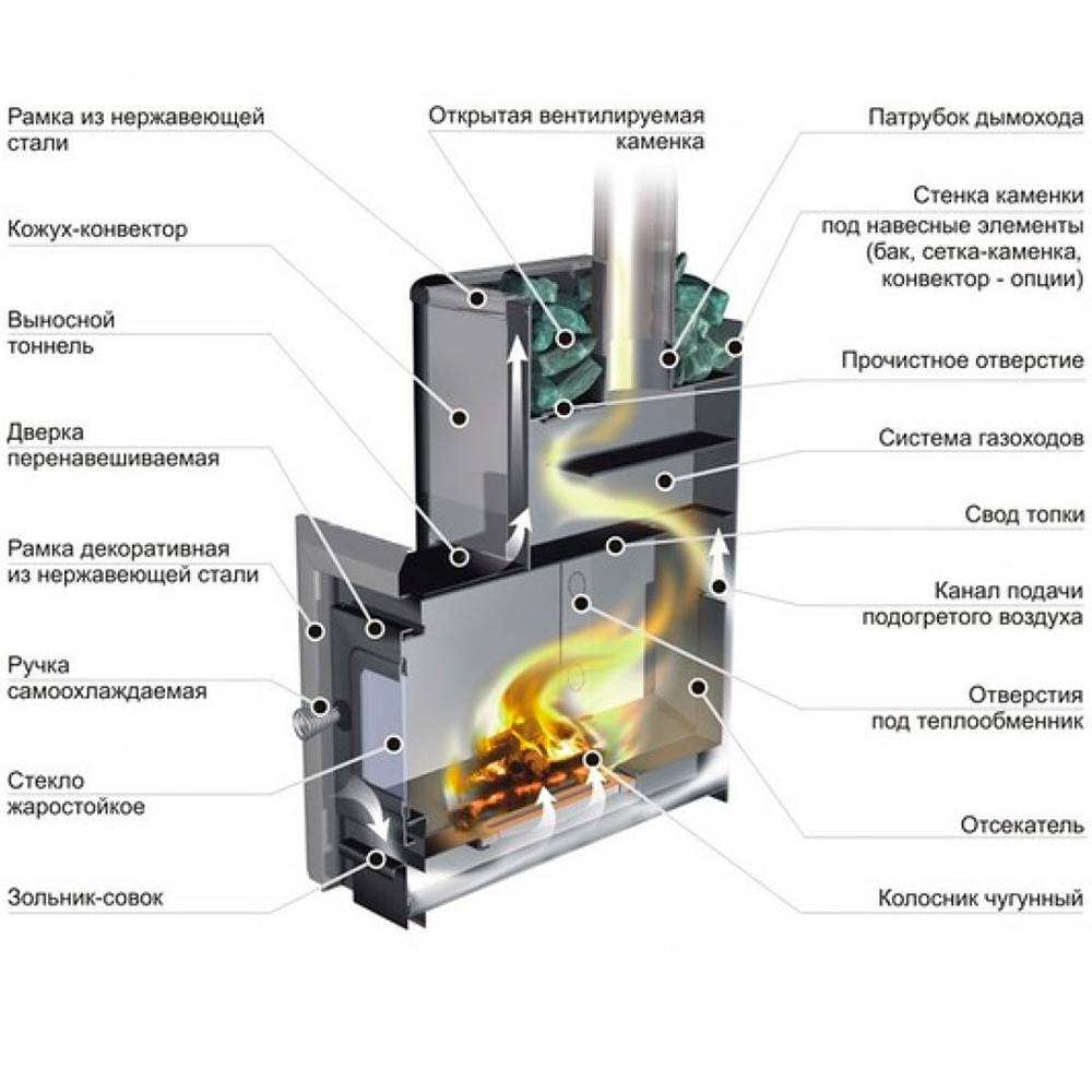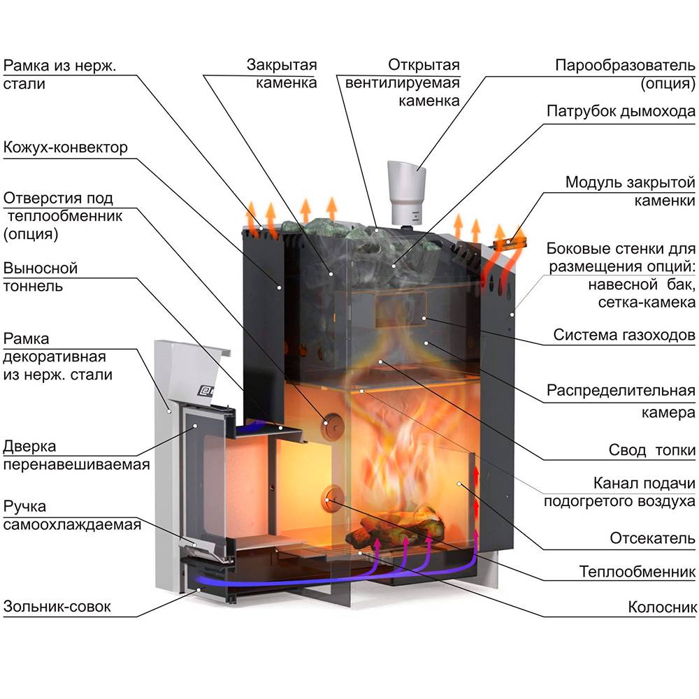 При выборе печи для бани нужно учитывать особенности устройства топки и каменки: