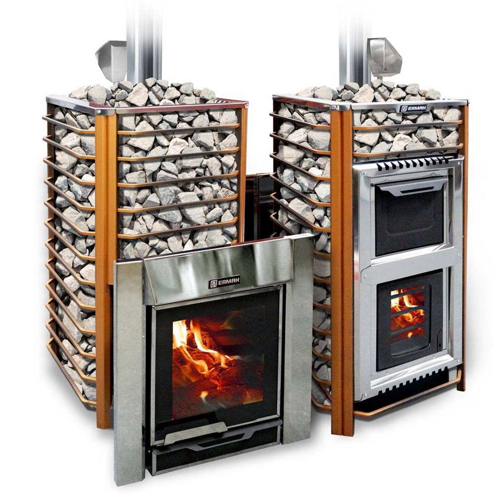 Помимо твердотопливных устройств Ермак выпускает и комбинированные агрегаты. При этом на печь, отапливаемую дровами, монтируют газовую горелку. Такая конструкция в силах обслужить целый ряд помещений: парилку, помывочное отделение, комнату отдыха. Кроме того, она в одно и то же время не только производит пар, но и кипятит воду.