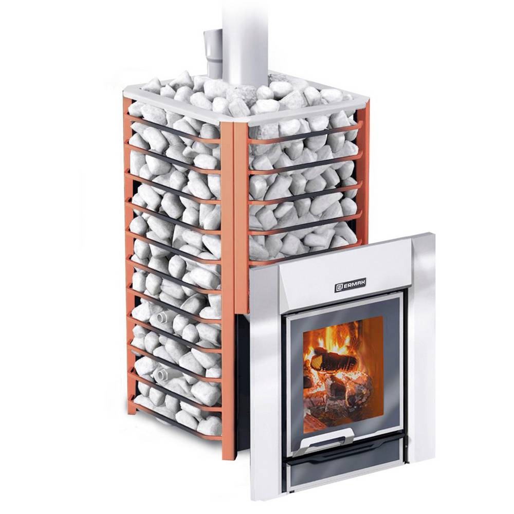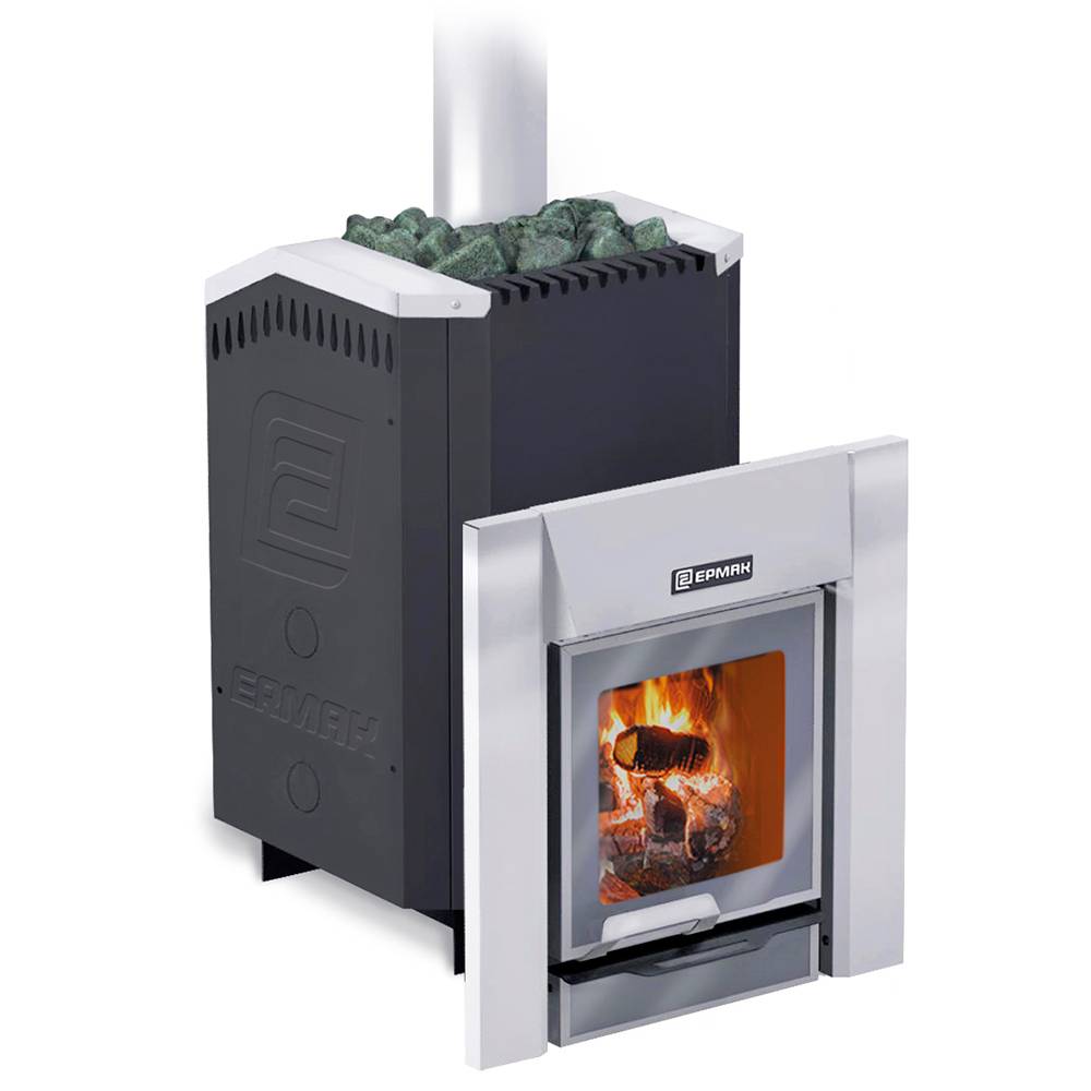 - «Ермак 30» имеет гораздо больший вес и объем, чем предыдущие модели. В данном случае монтаж каменки и теплообменника не создаст сложностей. Уровень влажности при использовании этого агрегата существенно повышается, поэтому модель подходит для установки в открытых парилках. Размер дымохода должен составлять минимум 65 мм. Печь может отапливать помещение площадью 35 м3. При необходимости в модели «Ермак 30» можно изменить тип каменки, а также существует возможность монтажа теплообменника. Модель может нагреть 40 кг камней и имеет бак для воды объемом от 55 до 65 л. Для нее требуется дымоход размером 65 мм. Имеет панорамное стекло, которое создает визуальный эффект камина.
