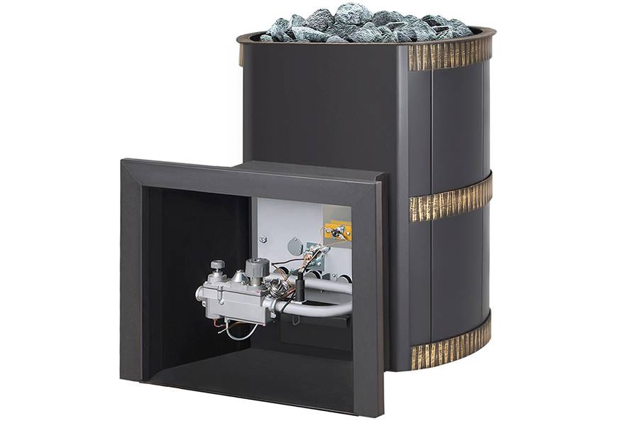 - Газовая. Главными элеметами является термостат и предохранитель, которые контролируют момент погашения пламени и прекращают подачу газа. Агрегаты более компактные, чем дровяные. Подключаются к общей газовой магистрали или к баллону со сжиженным газом. Можно регулировать температуру. Не требуется постоянный контроль при работе.