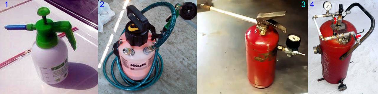 Также можно приспособить обычный садовый опрыскиватель и правильно выбрать компрессор. Из него извлечь штуцер, клапан, снять насос и установить заглушку. Получим 2 отверстия в опрыскивателе, вкрутить сгоны и закрепить, установить прокладки. В один из сгонов вкрутить обратный клапан со штуцером и на другом установить бачок.