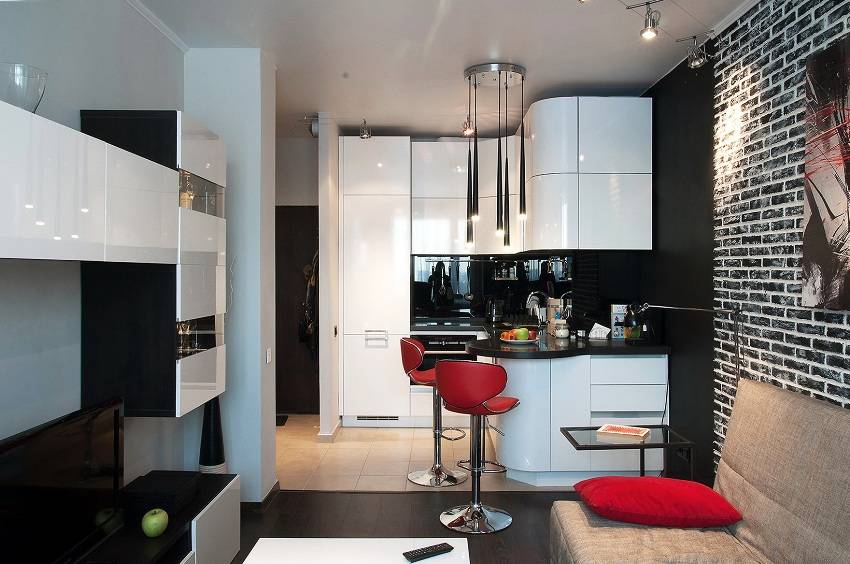 Глянцевые поверхности, практичность и красота — обязательные условия для однушки