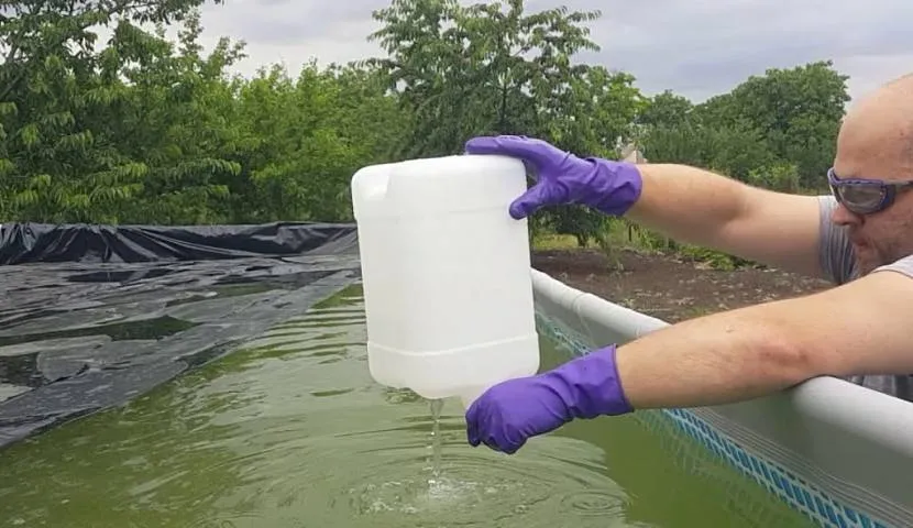После этого воду нужно немного перемешать с использованием палки или щетки, чтобы дезинфицирующее средство быстрее распределилось по всему объему бассейна.