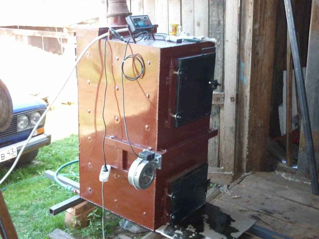 Более мощные котлы комплектуются вентилятором-дымососом, который устанавливается на верхней стенке корпуса на выходе дымоходного канала. При этом исключается появление обратной тяги и дверцу камеры газификации можно без последствий открывать даже в процессе горения.