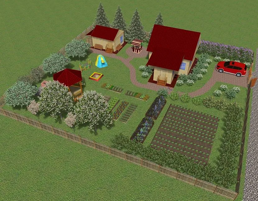 Для удобства можно сделать дорожки к саду и огороду, а также вокруг маленький декоративный заборчик, который обозначит садово-огородную зону и украсит ее.