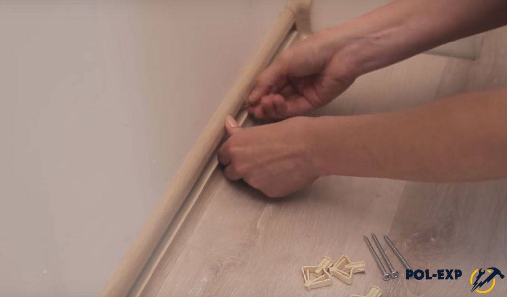 - Прикладывают плинтус к стене и вкручивают саморезы во все отверстия.