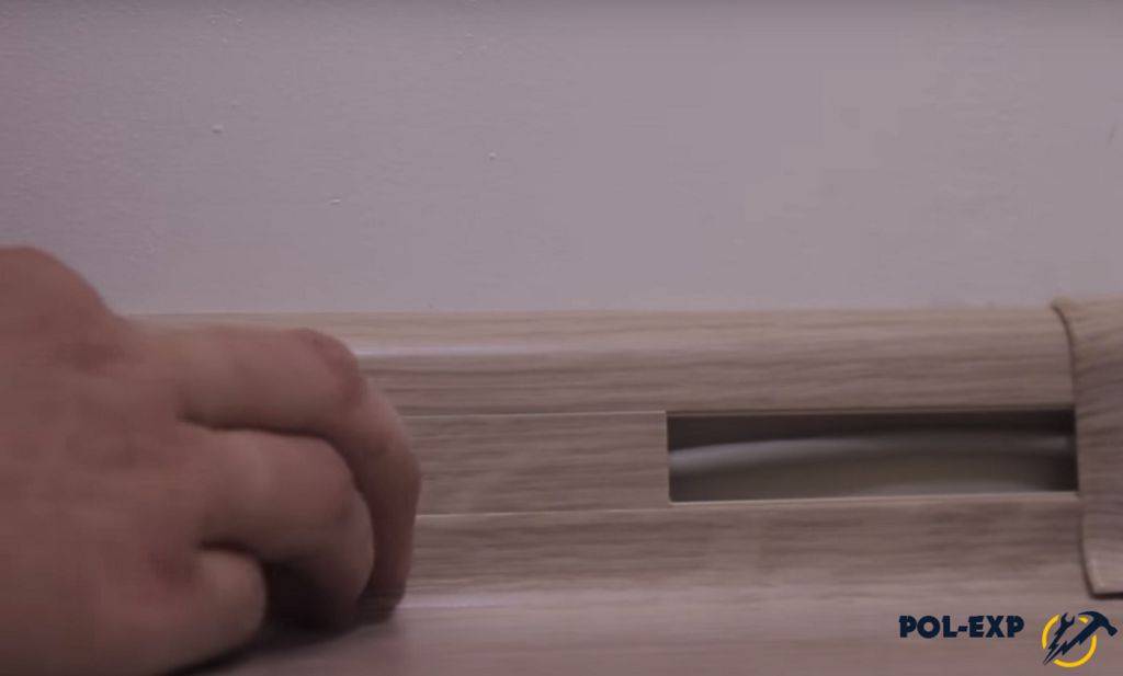 Если под такой плинтус все же планируют прокладывать кабель или провод, то его просто сдвигают, устанавливая под наклоном к стене.