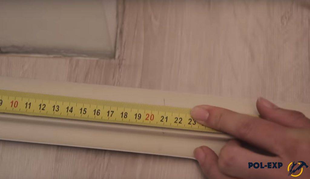 Совет: Чтобы плинтус встал на место без осложнений, и не упирался во внутренние перегородки вспомогательных элементов, после замера вычтите по 2-3 мм с каждой стороны.